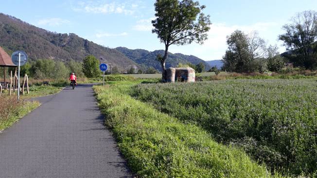 Day 5: Weather was back to sunny, and almost as soon as we set off, the bike path on the highway diverted to a well maintained path along the river. Sunny but chilly for a while as the hills on the other side of the river kept the morning sun from us. But after a while we were riding in sunshine again. Spotted about ten WWII bunkers dotted along the river. I’ve since learned that they were built by the Czechs as protection against the Germans.